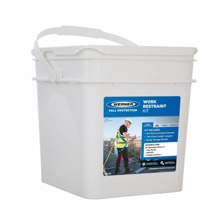 The Werner 79201 Work Restraint Kit comes complete with a one point harness and fixed length 1.8m lanyard which prevents the user reaching a position where a fall from height exists. Supplied in a waterproof bucket.